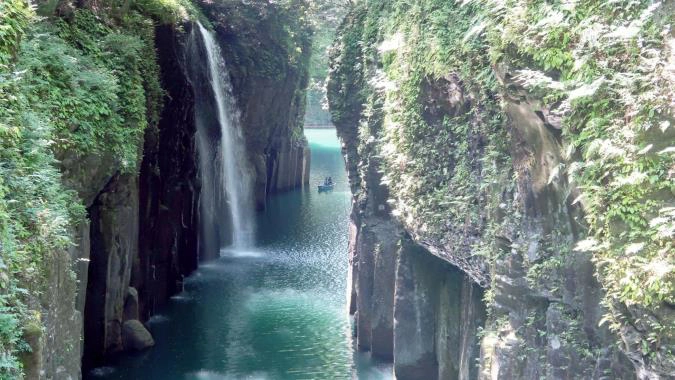 高千穗峽是五瀨川侵蝕阿蘇熔岩而形成的 V 字形峽谷,兩岸沿途是略帶紅色的安山岩絕壁。最值得一看的是翻騰著白色飛沫、從高達 17 米斷崖飛瀉而下的真名井瀑布。峽谷沿途建有約 600 米的徒步遊覽路,一年四季可以觀賞不同景色。