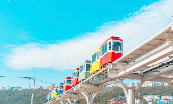 【海雲台天空膠囊SKYCAPSULE(四人一台)】過去是廢棄路線的釜山「東海南部線」,從廢棄的尾浦站,與青沙浦、松亭串連起來,成為釜山最近的話題「海雲台藍線觀光列車」。天空膠囊列車外觀設計復古,車廂整體不大,可容納4位乘客。但因車廂採用單軌來回,故行駛速度比為緩慢,從尾浦站到青沙浦約需30分鐘時間,在於行駛過程中,可以細細品味海雲台海岸線的美景,並飽覽周圍的民宅及步道。