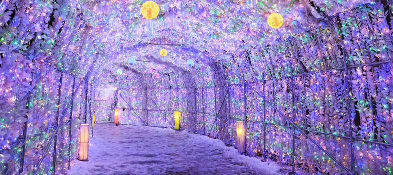 從洞爺湖溫泉街通往湖畔的道路,被40萬顆以上的LED燈泡所妝點,走入其中被耀眼的美麗燈飾所包圍,宛如置身在夢幻的彩燈世界中,感受濃厚的節慶氣氛,呈現出與白天截然不同的氛圍。(須入住洞爺湖周邊飯店)